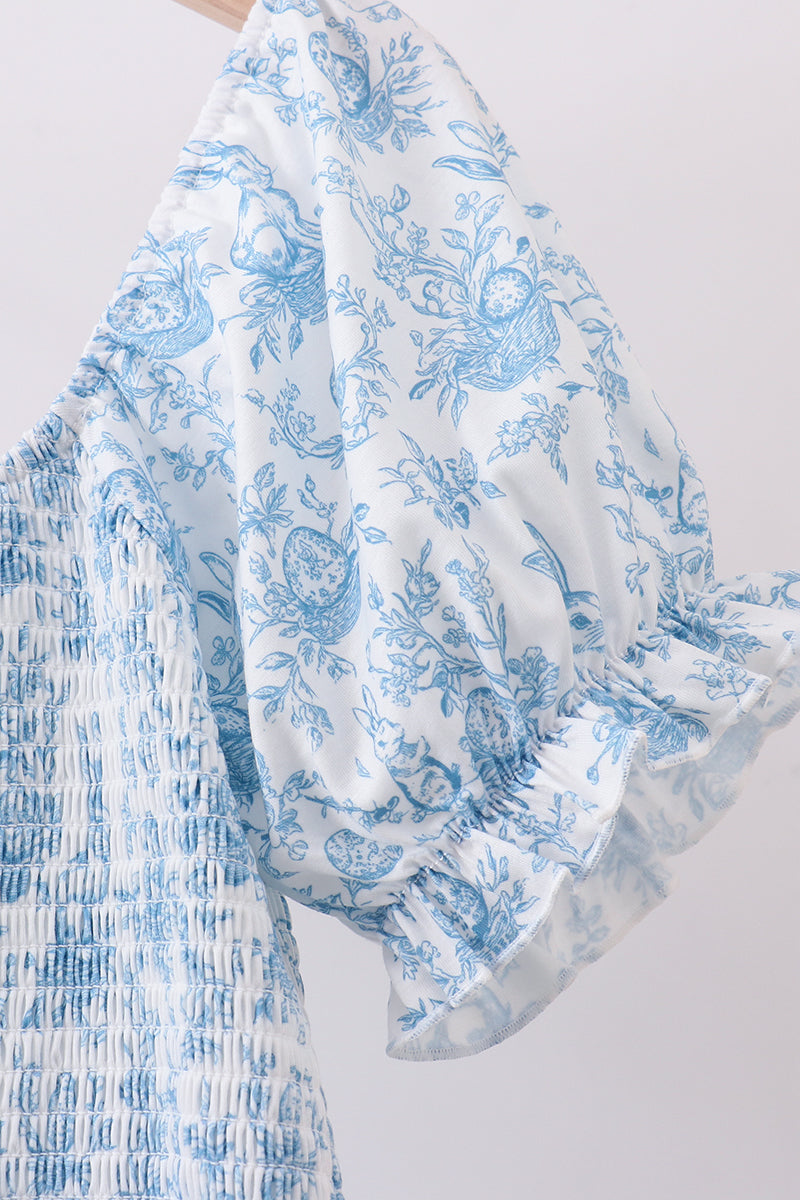 Hop into spring style with this charming blue bunny egg smocked dress! Featuring delicate smocking details and a whimsical bunny egg print in soft blue tones, this piece brings playful elegance to your wardrobe. The smocked bodice offers a flattering fit while the flowing silhouette keeps you comfortable all day long. Perfect for casual outings, garden parties, or whenever you want to add a touch of whimsy to your look. A delightful choice for anyone who loves unique, conversation-starting fashion!