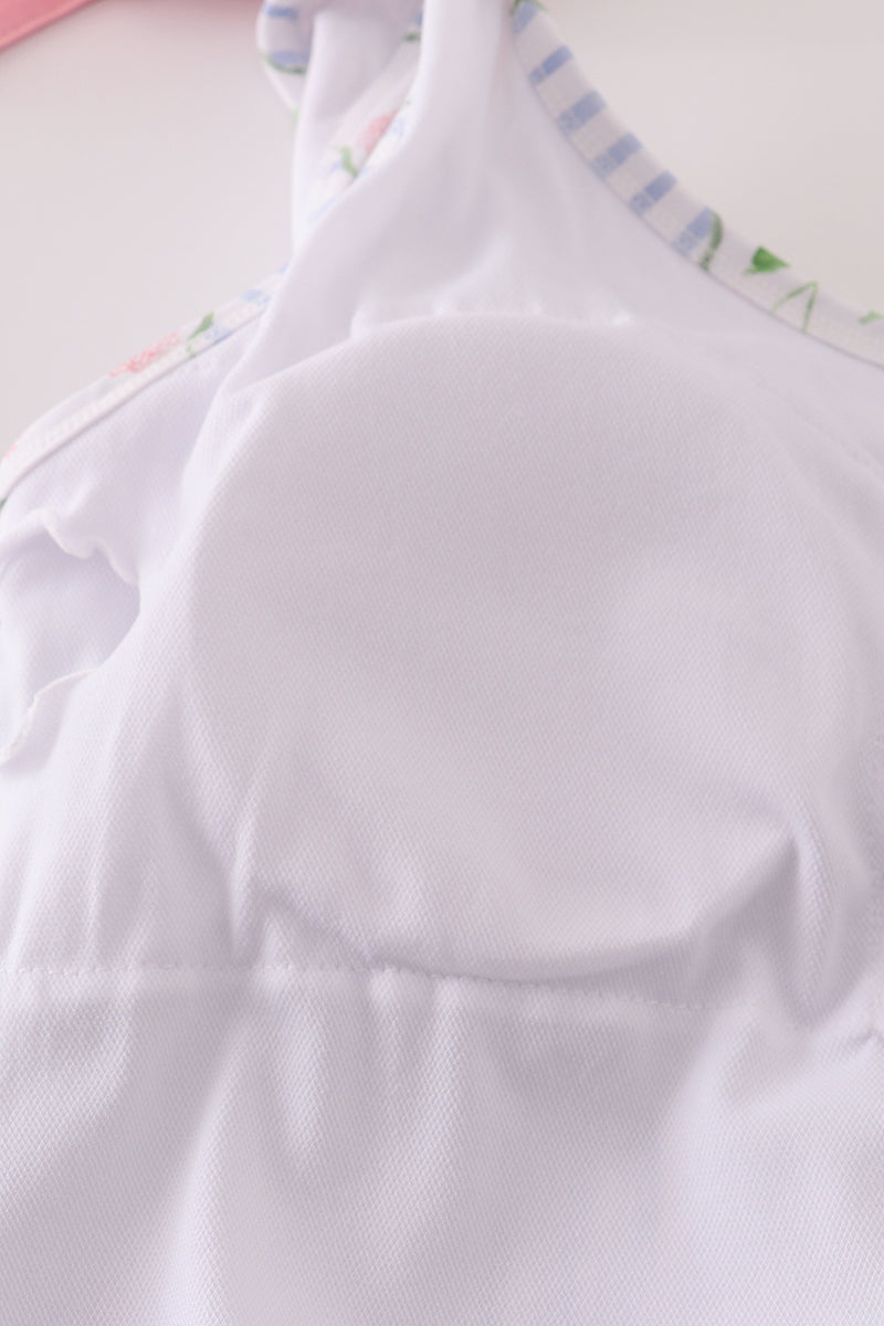 Dive into summer with our playful Floral Stripe Bow Swimsuit! This adult swimsuit combines eye-catching floral patterns with stylish stripes and a charming bow detail. The UPF50+ protection keeps your skin safe while you splash around, giving you peace of mind during all your sunny adventures. Perfect for beach days, pool parties, or tropical getaways!