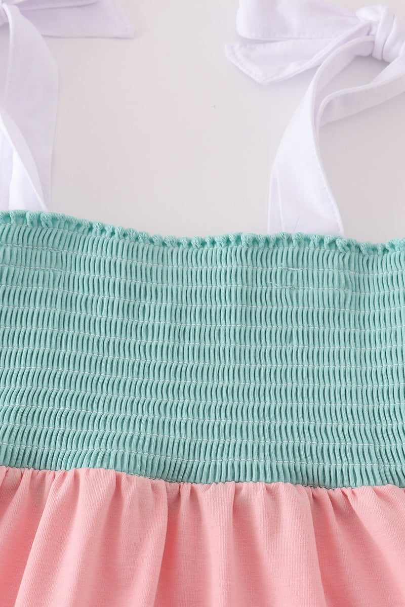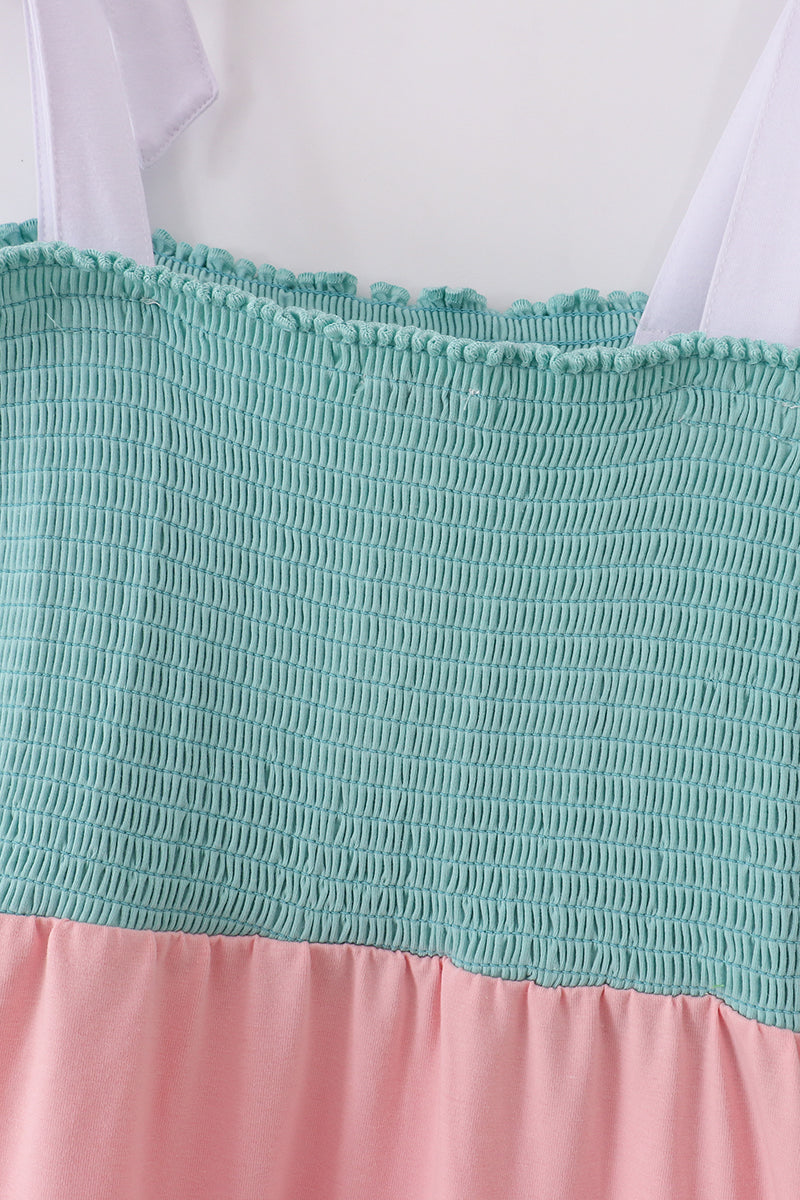 This playful and colorful dress is a must-have for any mother and daughter duo. With tiers of vibrant colors and a smocked design, it's perfect for a day out or a family photo shoot. Get ready to turn heads and make memories in this unique mom and me dress.