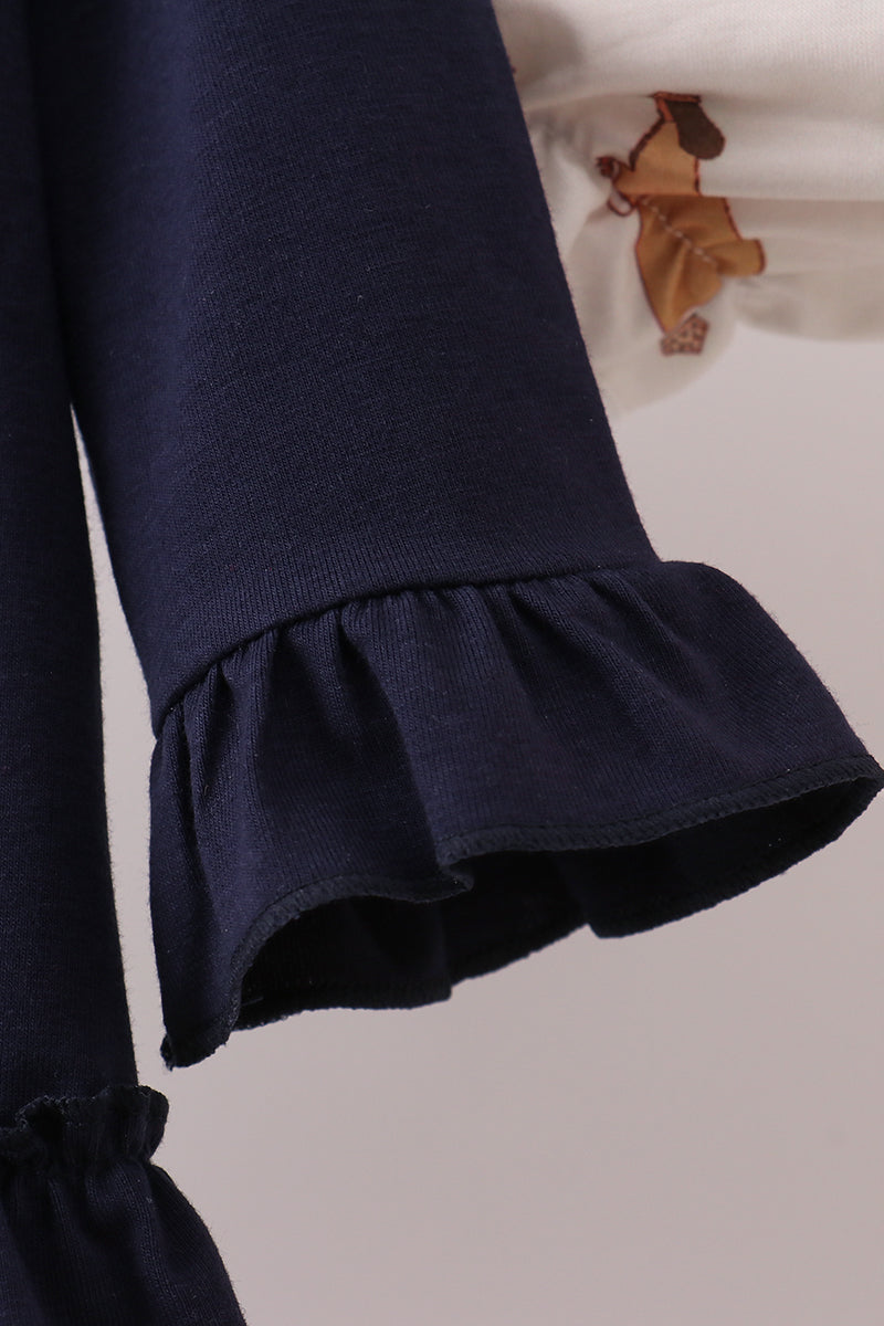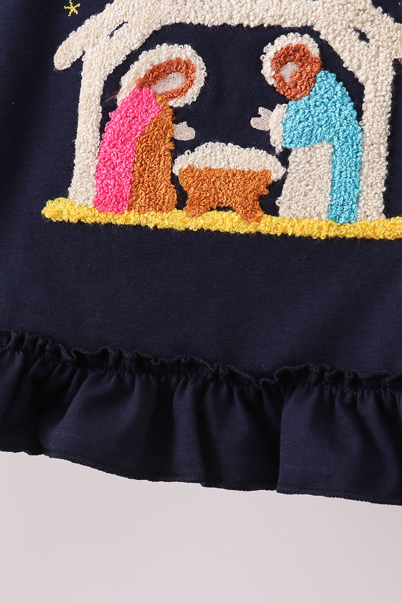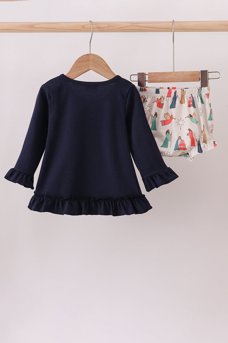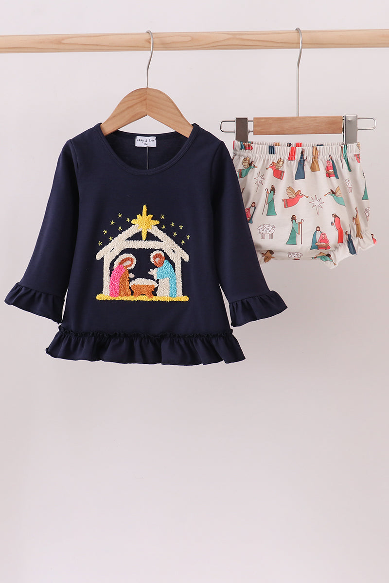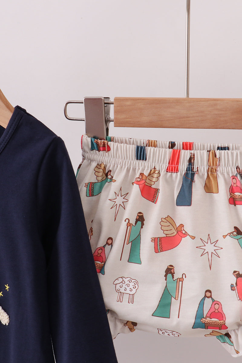 Dress your little one in festive charm with this Navy Nativity French Knot Bloomer Set. Featuring delicate French knot embroidery inspired by nativity scenes, the soft navy fabric offers comfort and style for all-day wear. Perfect for holiday photos or spirited family gatherings, this playful set adds a sweet, classic touch to your baby's wardrobe.