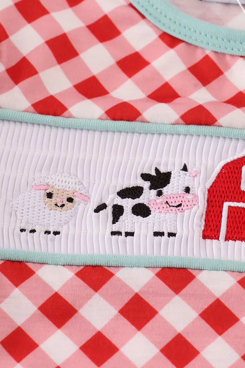 Bring a splash of charm to your wardrobe with this playful red farm smocked ruffle romper. Featuring delicate smocking and flirty ruffles, it offers a comfortable fit perfect for sunny days and casual outings. Its vibrant red hue adds a cheerful touch, making it an easy choice for fun, carefree style.